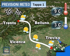 La tappa sarà caratterizzata da poche nubi e generalmente innocue, specie in mattinata e in serata sui rilievi.